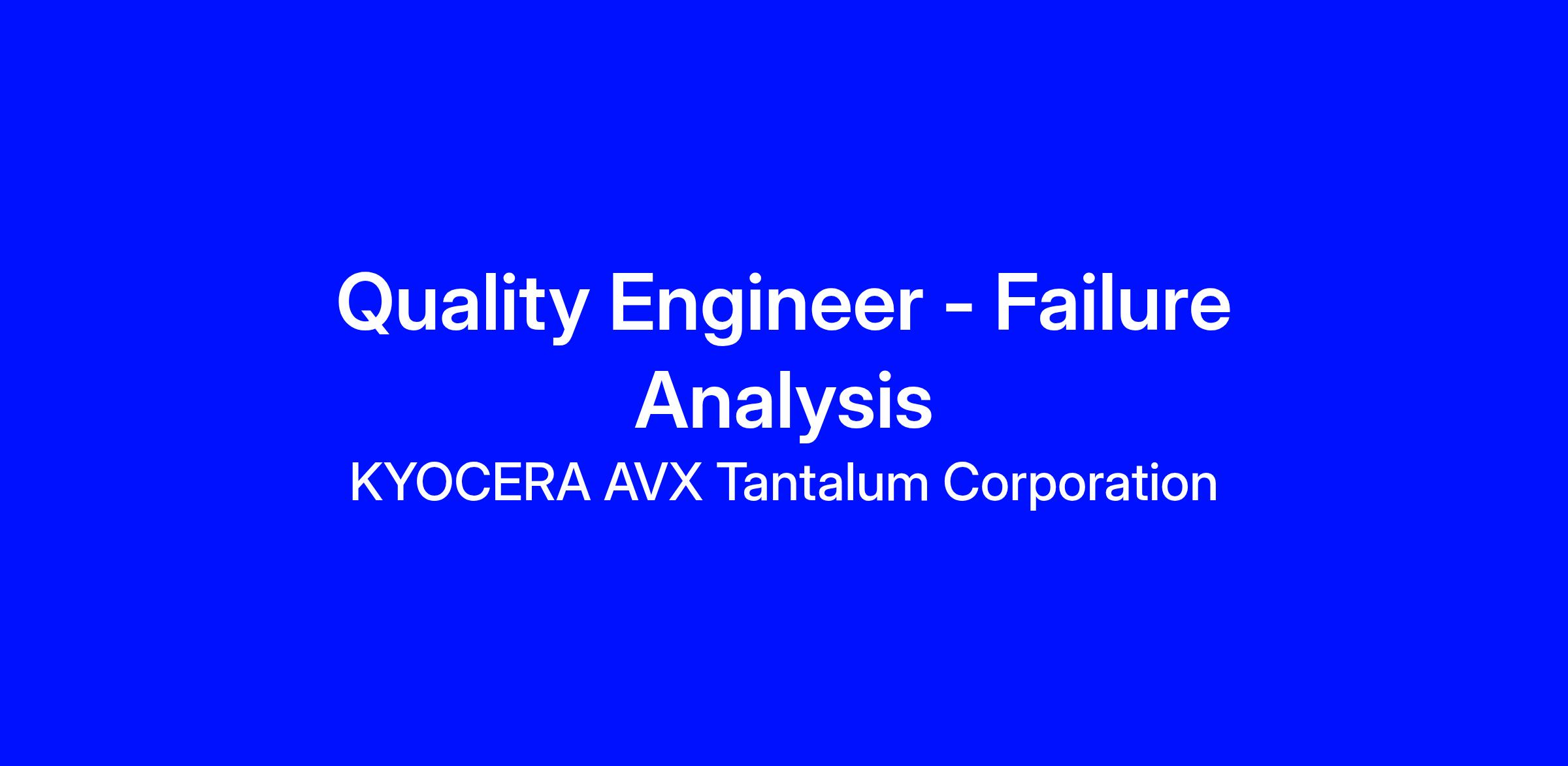 The Failure Analysis Engineer will be responsible for all quality related aspects of product analysis, new product qualification, process evaluation and reliability testing. They will conduct complex theoretical and experimental investigations in manufacturing, research, design, and scientific applications for tantalum capacitors. The investigations will require hands-on failure analysis, gathering data to support your findings, and applying scientific principles of electrical, mechanical, or chemical nature. KAVX Biddeford is a AS9100, ISO19001, and ISO13485 certified manufacturing plant.