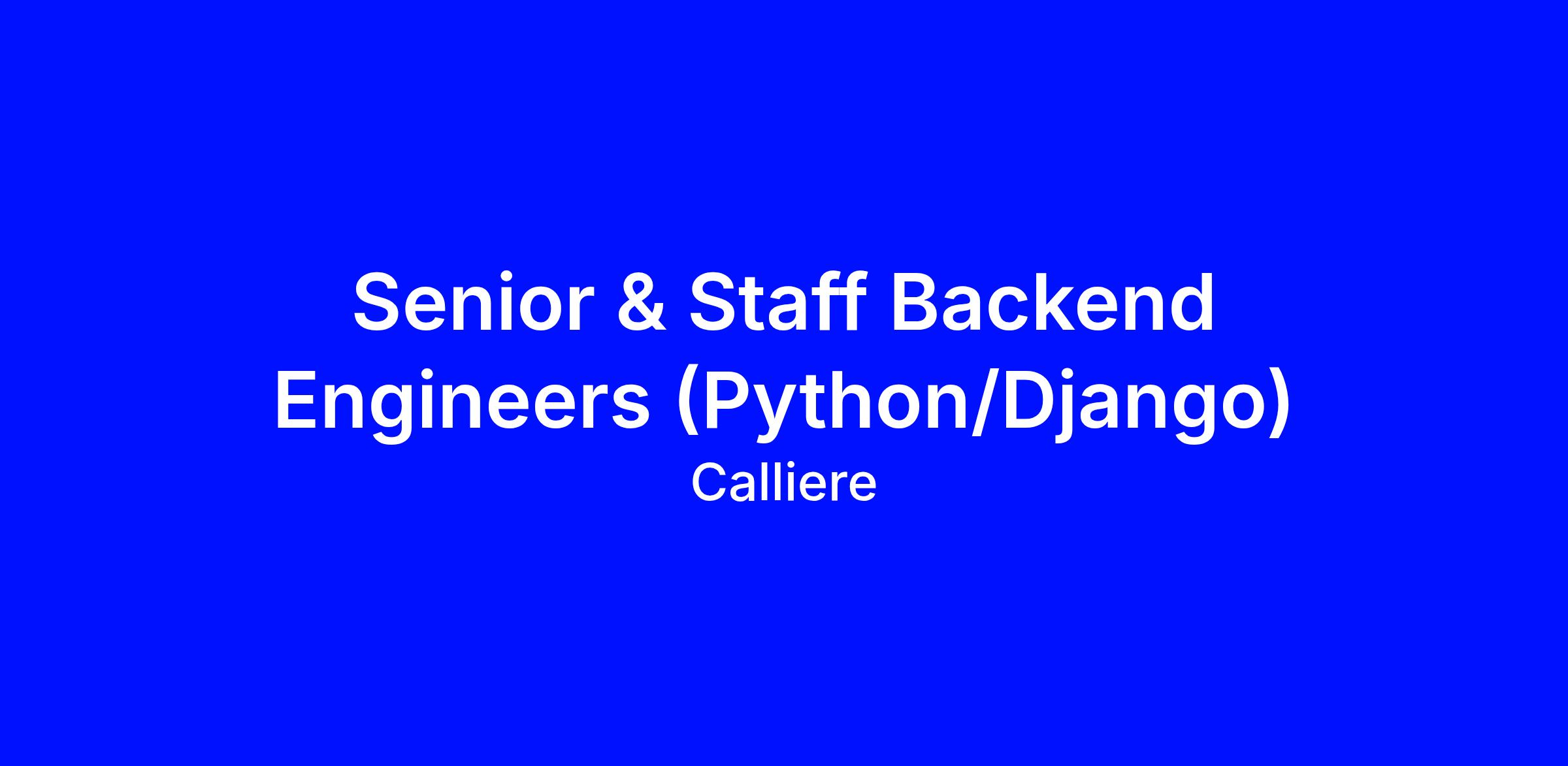 <\/html>"}}],"isMobile":false,"iframe":"true","jobType":"Full time","applyName":"Apply Now","zsoid":"688258619","FontFamily":"Verdana, Geneva, sans\-serif","jobOtherDetails":[{"fieldLabel":"Salary","uitype":1,"value":"Up to $220,000 USD + Amazing Perks."},{"fieldLabel":"Industry","uitype":2,"value":"Technology"},{"fieldLabel":"City","uitype":1,"value":"New York"},{"fieldLabel":"State\/Province","uitype":1,"value":"New York"},{"fieldLabel":"Zip\/Postal Code","uitype":1,"value":"10013"}],"headerName":"Senior & Staff Backend Engineers (Python\/Django)","widgetId":"531753000000072311","isJobBoard":"false","userId":"531753000000248003","attachArr":[],"customTemplate":"3","isCandidateLoginEnabled":false,"jobId":"531753000015892011","FontSize":"12","googleIndexUrl":"https:\/\/callieregroup.zohorecruit.com\/recruit\/ViewJob.na?digest=u6RCQRHkFYC6J5ac54igRVicPvVb.QI8H3N8SDJR8lQ\-&embedsource=Google","location":"New York","embedsource":"CareerSite","indeedCallBackUrl":"https:\/\/recruit.zoho.com\/recruit\/JBApplyAuth.do","logoId":"1gvk5a9fa9ad9912143c8885985d92ce2ae5f"}
